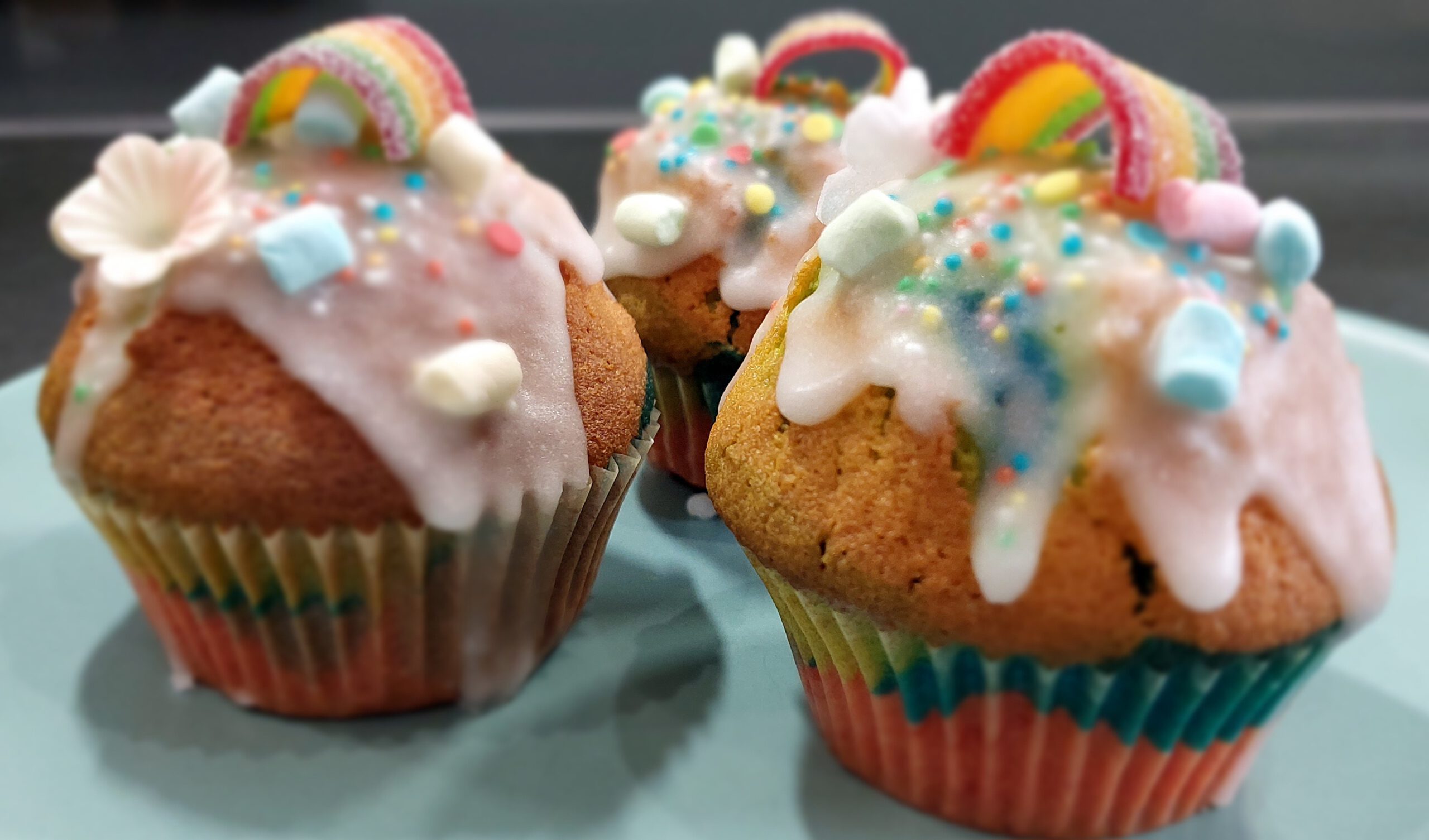 Einen Muffin kopfüber in den Zuckerguss tauchen und mit Zuckerstreuseln, Regenbogenband, Esspapierblüte sowie Mini-Marshmallows dekorieren. Hierbei sollte zügig gearbeitet werden, denn wenn der Zuckerguss aushärtet, hält die Deko nicht mehr.