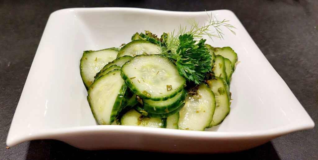 Jetzt die Salatgurken mit Wasser gründlich abspülen, in eine Schüssel geben und mit dem Dressing vermengen. Den Gurkensalat für mindestens eine Stunde kühlstellen damit er das Dressing aufnehmen kann. Dann die Gurken abgießen und den Salat servieren.
