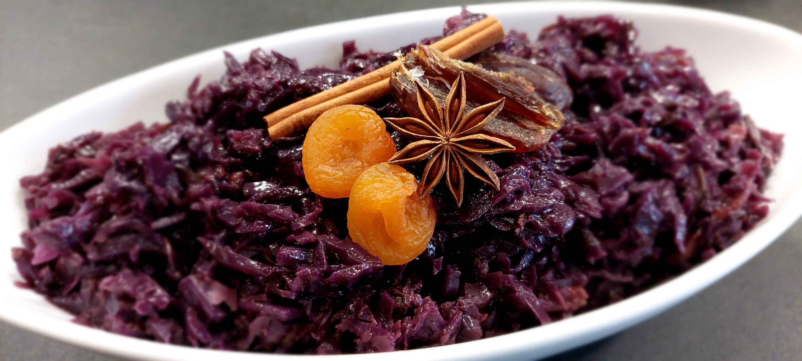 Die Aprikosen und Datteln in kleine Stücke schneiden. Diese 15 Minuten vor Ende der Garzeit zum Rotkohl geben und mit garen. Zum Abschluss den Rotkohl nochmals nach Belieben mit Salz und Zucker abschmecken.