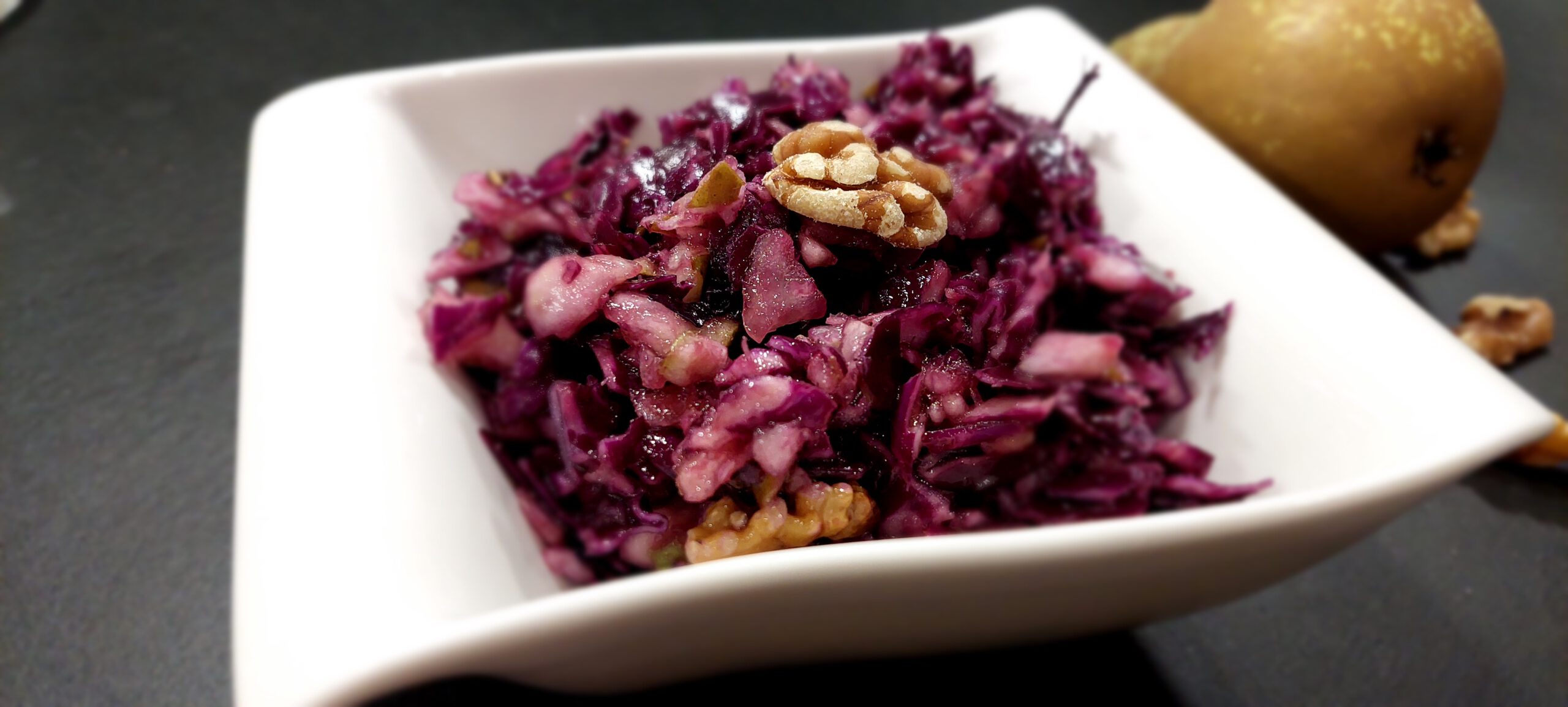 Den Rotkohl hobeln und zusammen mit den Birnen-, Zwiebel-, Scharlotten- sowie Walnussstückchen in eine Schüssel geben und vermengen.