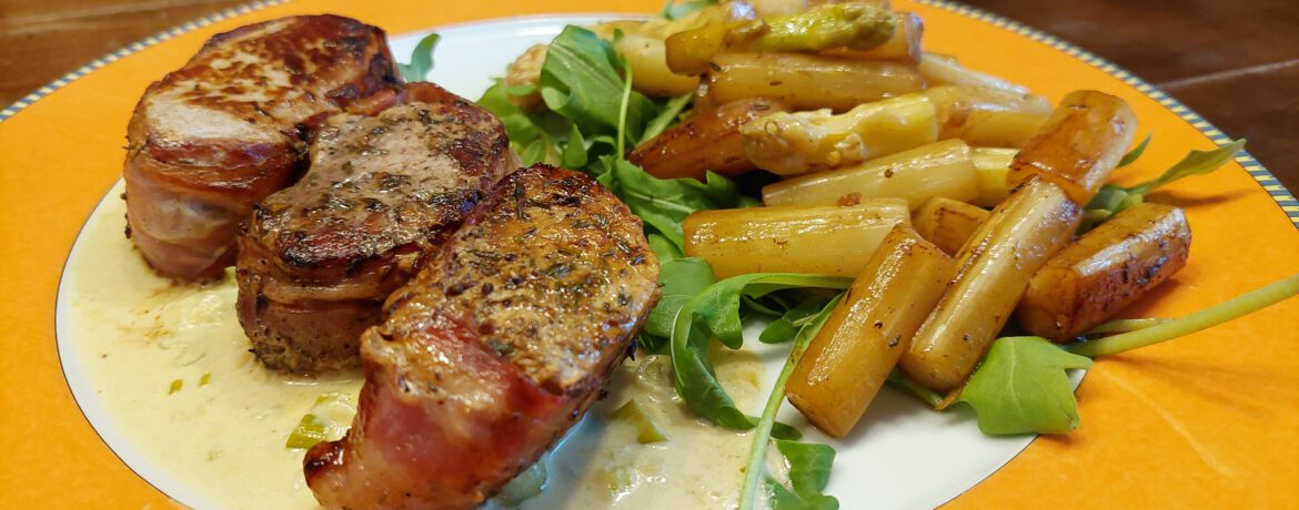 Zutaten (2 Personen): – 500 g Schweinefilet– 100 g Bacon (12 Scheiben)– 80 g Rucola– 750g Spargel (weiss)– 1 EL Rapsöl– 1 TL Butter– 1 TL Thymian (getrocknet)– 1 TL Salz– 1 Prise Zucker Sauce:– 2 Frühlingszwiebel– 250g Sahne– 2 TL Senf– 1 TL Butter– Salz– Pfeffer Zubereitung:Spargelstangen mit Hilfe eines Sparschälers schälen, das unterste […]
